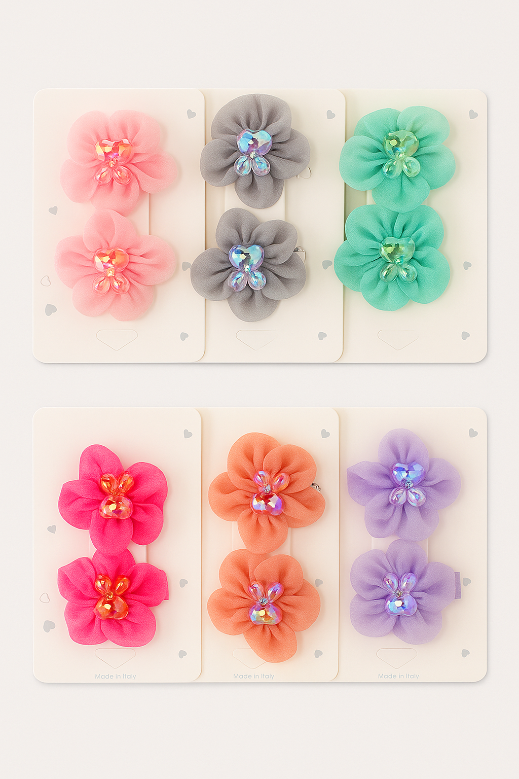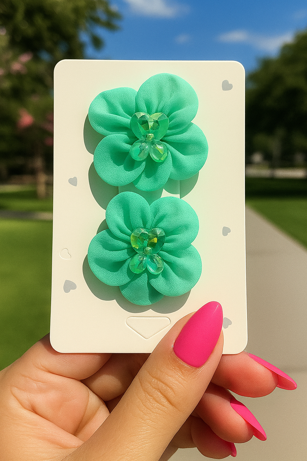 Moñas decorativas con diseños de flor o conejo, ideales para darle un toque tierno y colorido a cualquier peinado.
