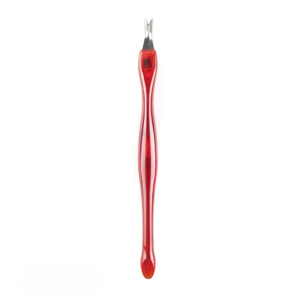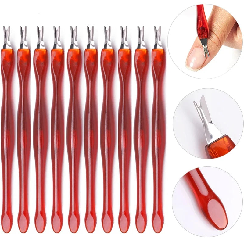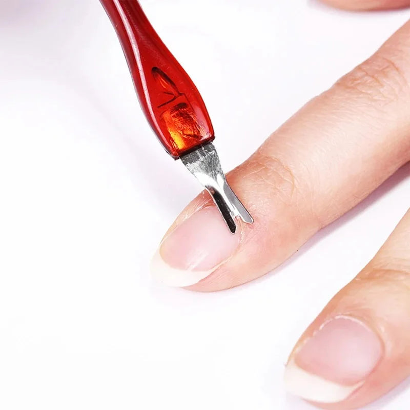 Herramienta metálica tipo pata cabra sin caucho, con punta lisa para el cuidado y limpieza de uñas.